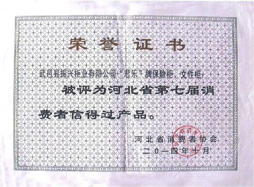 河北省消費者信得過產(chǎn)品證書